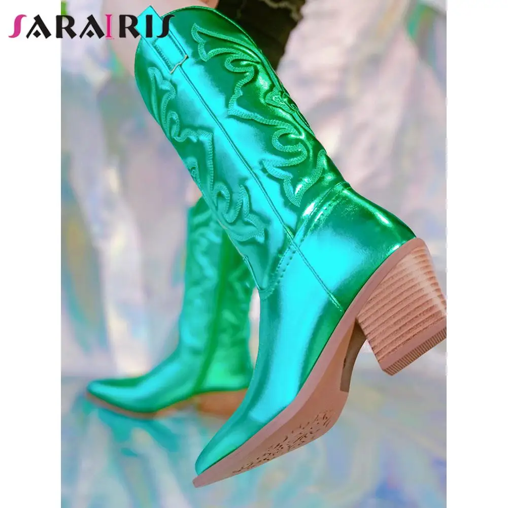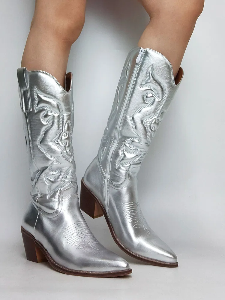 Autumn Winter 2022 Women's Western Mid Calf Boots Modern Chunky Heels Retro Cowboy Cowgirl Booties Vintage Shoes For Woman